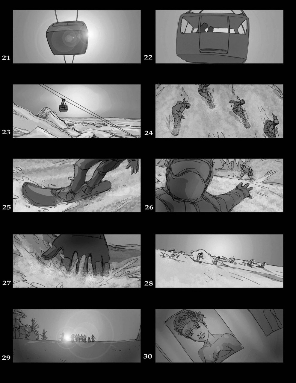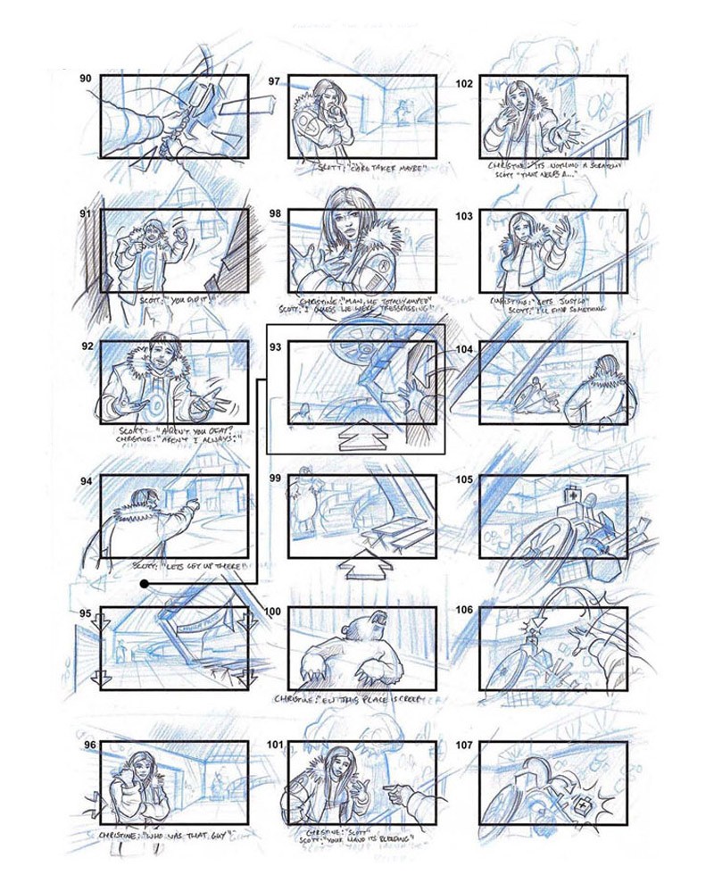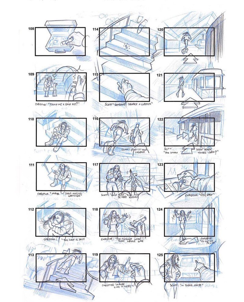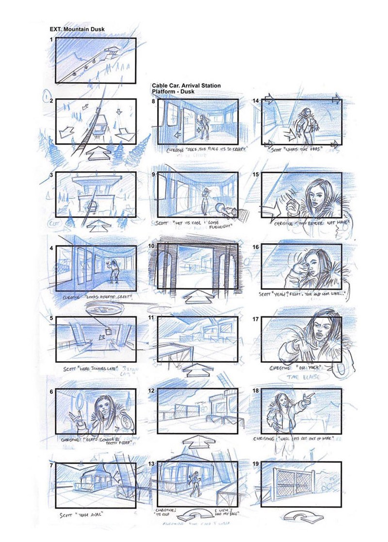 According to the design doc, Episode 1 would start with Scott and Chrissie breaking into a ticket office to take the final cable car of the day up to the top of the mountain to meet with the others. Storyboards and prototype footage seem to suggest, however, that on the way up, both characters would have a run-in with a ranger named John, an "old hobo-like character" not too dissimilar from the character portrayed by Larry Fessenden in the finished version. As our sources tell us, this figure would have also acted as a red herring while piecing together the identity of the killer but was simply trying to warn the couple about the dangers of the mountain.
