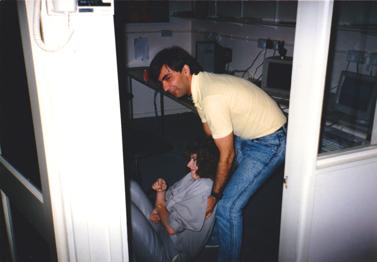 [I have a few stories that I can share]. One morning I came in to work and all my gear was turned upside down. They thought they were so funny! Another... they would fight and tussle in the corridors and wrap a couple of staff up in tape. One time they were discovered by Jon Woods while doing this, and all got a bollocking. We got a bollocking for taking 2.5hr lunch breaks one time too (David Collier was the software manager, pre-Gary Bracey). Basically, it was a very immature time back then.