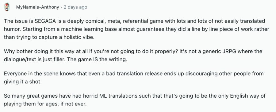 On the flip side, the fact that so many games remain untranslated might be seen as a strong argument for leveraging AI to speed things up and bring more Japanese titles to a wider audience. Despite issues with the quality of the SEGAGAGA translation, many people seem very happy to finally be able to play the game properly.