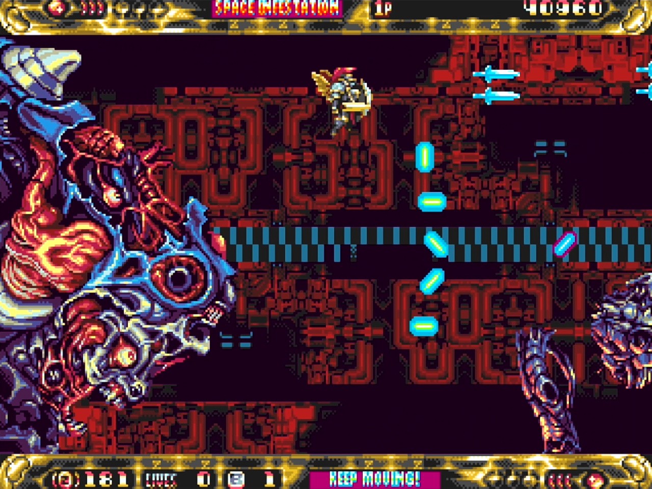 Players pick between one of three playable avatars (Knight, Gold, and Gladius) before blasting off across seven visually distinct stages. Unlike other retro shoot 'em ups on the market, there are no weapons to collect during these stages, with the game instead borrowing a shop mechanic, similar to Lords of Thunder, where you can purchase upgrades to your ship with credits you've earned.