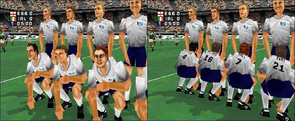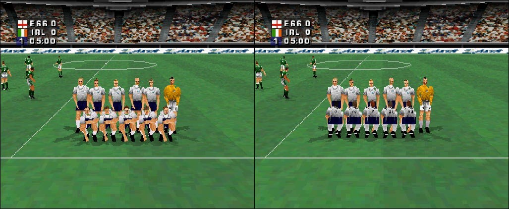 To activate this secret, you need to go through multiple steps, as outlined here – this cheat is only possible when using one of the hidden teams (England's 1966 World Cup-winning side), with the Republic of Ireland being the second team selected (I'll leave it to you to speculate on the reasons this match-up is significant, but suffice to say that whenever England and Ireland play football, there's often fireworks).