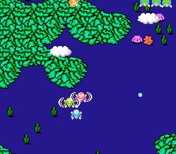 Each of these versions is slightly different from one another, with the NES version notably removing a couple of dialogue scenes from the beginning and end of the game (featuring TwinBee, WinBee, and GwinBee) and cutting out the ability to play with three players. The later Famicom version, on the other hand, was pretty much virtually identical to the FDS version but featured an additional option to pick the game's difficulty on its title screen.