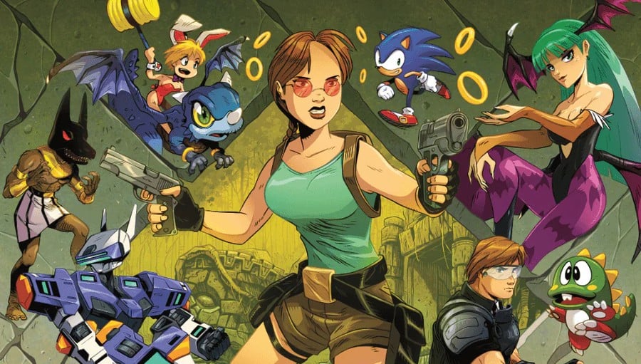 The cover image features Tomb Raider's Lara Croft, Sonic the Hedgehog, Darkstalkers' Morrigan, Keio Flying Squadron's Rami Nanahikari and Virtual-On's Temjin, as well as other characters, all of whom have entries on Sega systems.